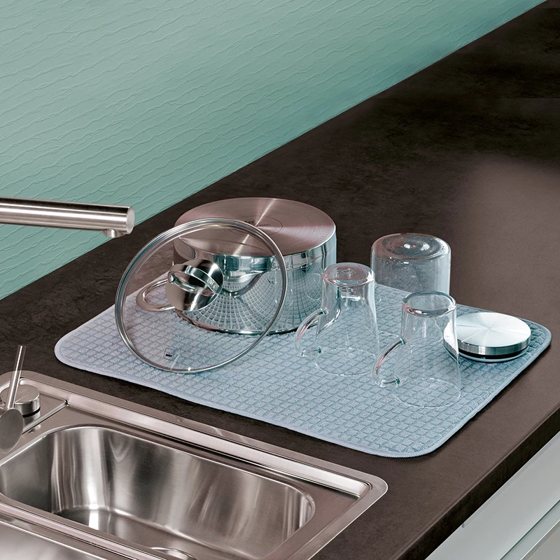 Ob mit oder ohne Spülmaschine, viel oder wenig Geschirr, diese Abtropfmatte ist auf jeden Fall nützlich. Sie besteht aus Polyester und ist 50 x 38 cm groß. Dank der wasserabsorbierenden Schicht, wird Ihre Arbeitsfläche oder Spülablage vor Wasserflecken und jeglichen Kratzern geschont. Doch nicht nur Ihre Arbeitsfläche schonen Sie mit der Abtropfmatte – auch Ihr Geschirr liegt weich und sanft auf. Die Abtropfmatte hat die besondere Eigenschaft, dass sie durch eine Luftzirkulation schnell Ihr Geschirr trocknet. Ein weiterer Vorteil ist, dass die Matte Fleckenresistent ist und sich bei 40° ganz einfach in der Waschmaschine waschen lässt. Bei der Farbauswahl sollte auch die passende Variante für Ihren Einrichtungsstil dabei sein! Mit heißen Gegenständen sollte die Abtropfmatte aber nicht in Berührung kommen.
