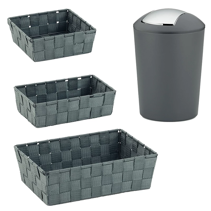 Die edlen und klassischen Körbe im geflochtenen Stil der Serie Alvaro sind aus PP-Faserband gefertigt und der Schwingdeckeleimer ist aus Kunststoff. Das Set besteht aus folgenden Artikeln: