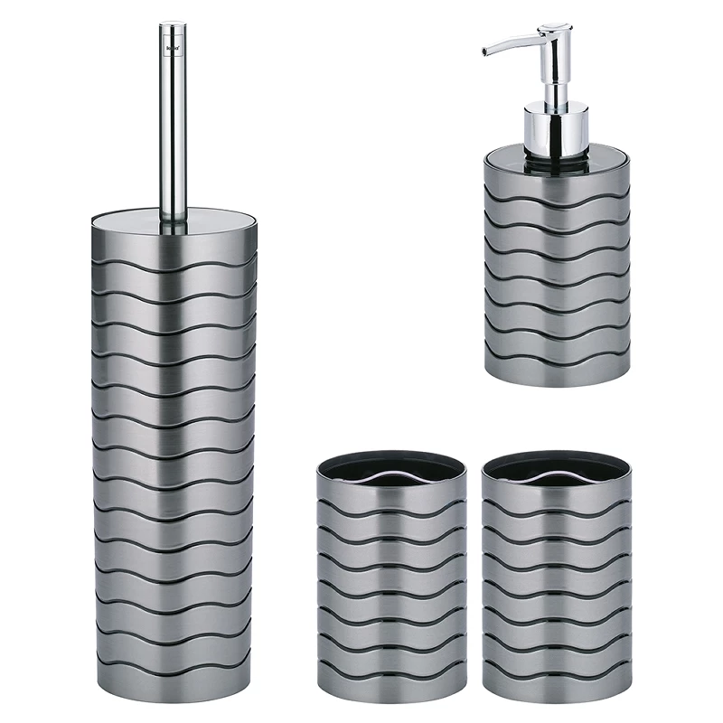 Badserie Muna– in modernem Metallic-Look. Die Accessoires dieser Serie bestehen aus pflegeleichtem Kunststoff. Dieses praktische Set beinhaltet viele wichtige Klein-Accessoires, die man in einem Badezimmer benötigt.