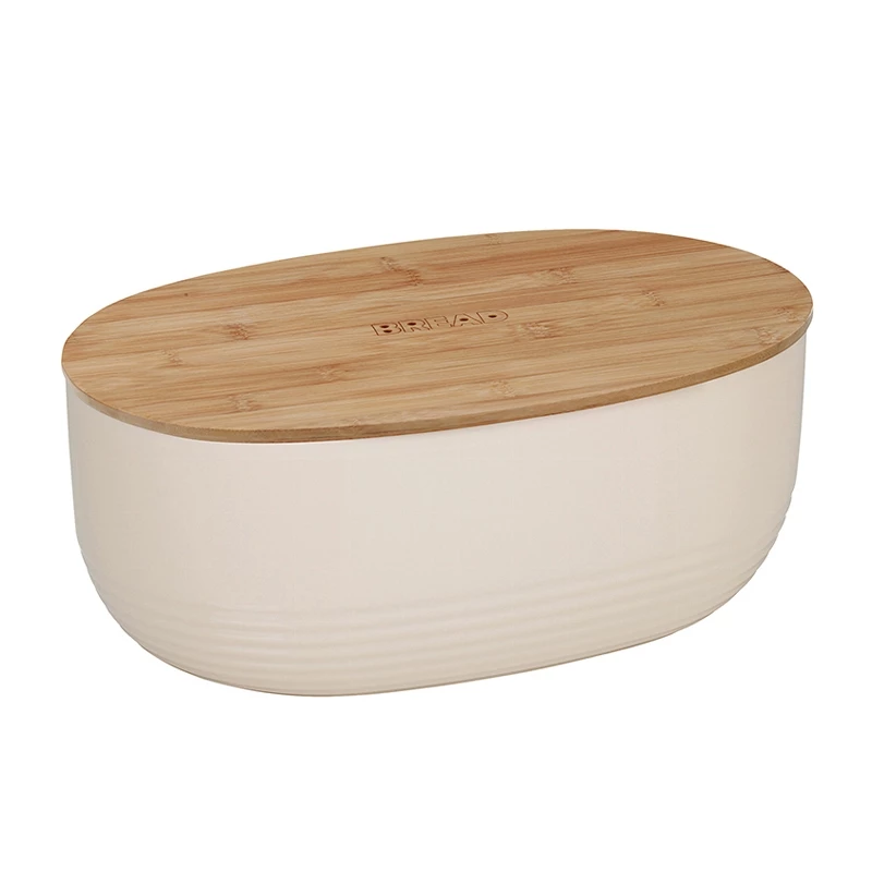 Brotkasten Namur aus PS-Kunststoff mit Bambusdeckel, beige. Maße: 37,5 x 23 x 14 cm.