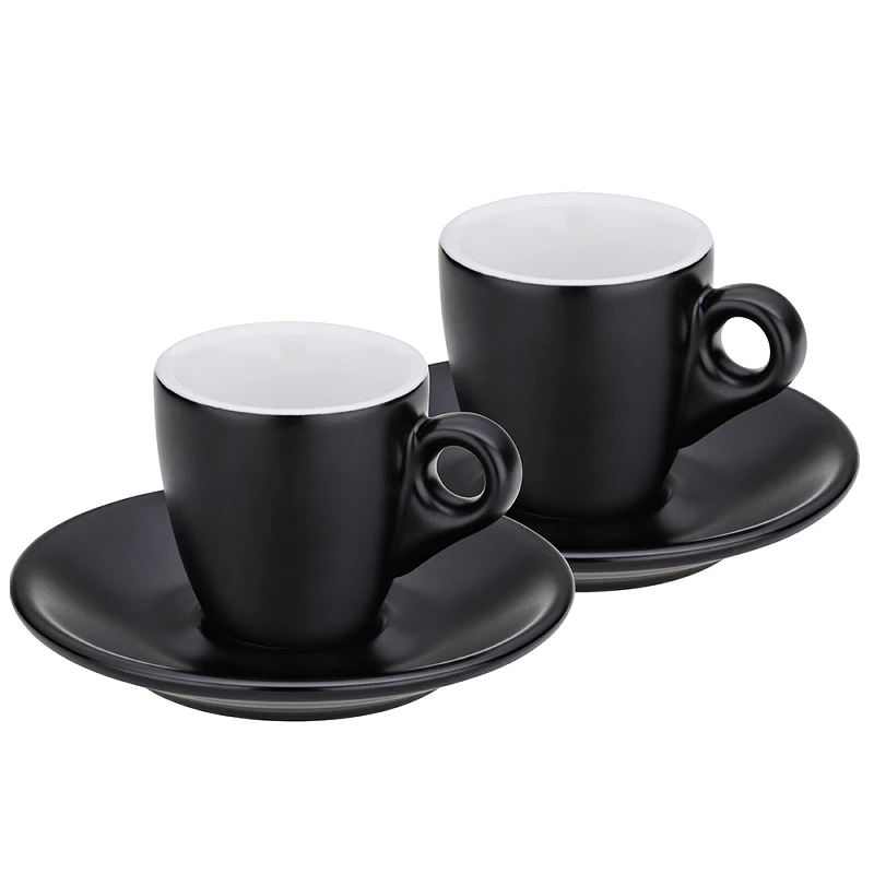 Espressotassen-Set Mattia aus Keramik bestehend aus 2 Espressotassen, jeweils + Untersetzer in matter Optik, Schwarz. 50 ml fasst eine Tasse, Durchmesser Untersetzer: 12 cm.
