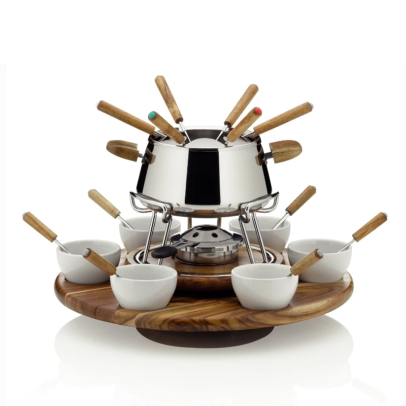 Wenn die Temperaturen sinken, beginnt die Zeit der gemütlichen Fondue-Abende im Freundes- oder Familienkreis. Mit dem eleganten und praktischen Fonduekarussell ARMATA, mit den formschönen weißen Keramikschälchen samt passenden Fondue-Gabeln und -Löffeln wird der Fondue-Abend eine runde Sache. Der große Vorteil des drehbaren Untersetzers aus Akazienholz: Jeder ist gleich nah dran an den Saucen, Dips und Leckereien in den Keramikschälchen.