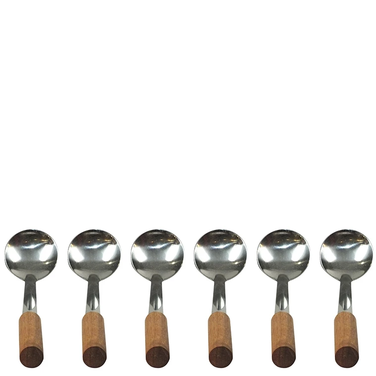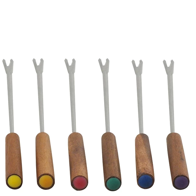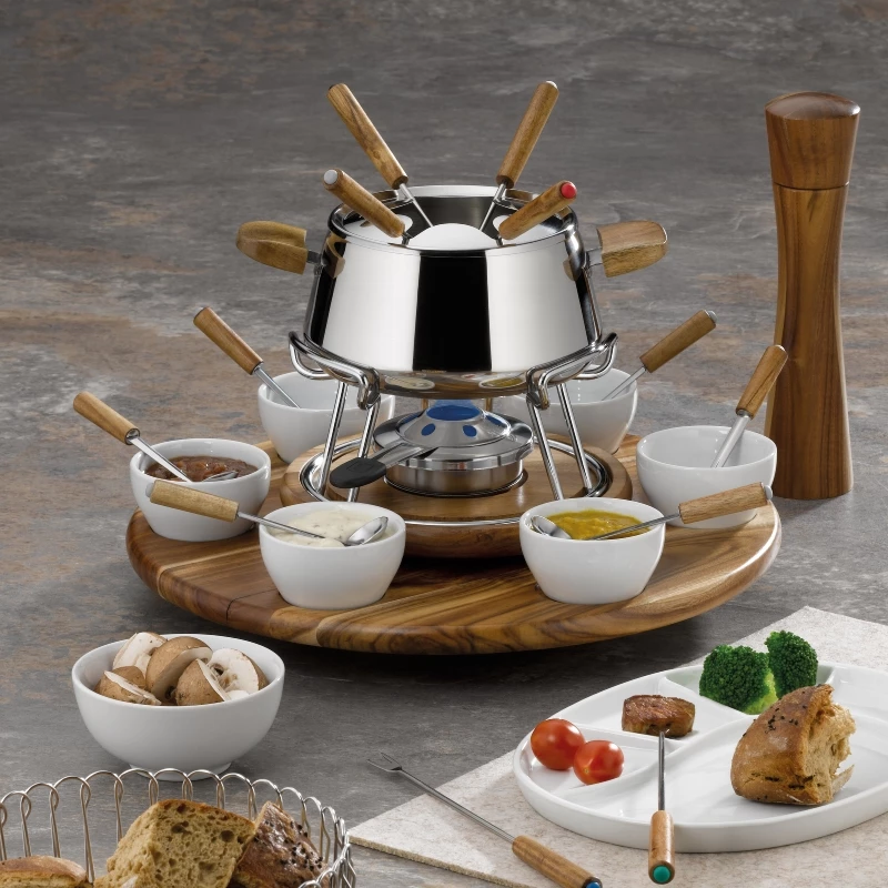 Die Griffe von Fondue-Topf, -Löffeln und -Gabeln sind aus Akazienholz. Die Gabelköpfe sind farbig markiert.