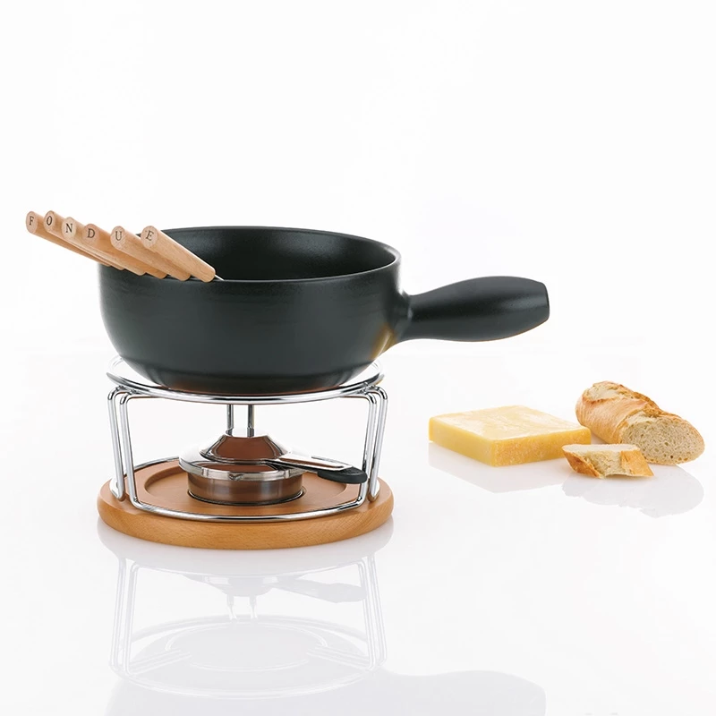 Ein Käsefondue hat nicht nur für die Schweizer Tradition, ist es doch schmackhaft, gemütlich und gesellig. Also genau das Richtige, um an langen Winterabenden mit Freunden zusammen zu speisen. Und welche „Strafen“ es für das Brotverlieren gibt, bleibt ganz der Fantasie der jeweiligen Runde überlassen. Das Käsefondue Set NATURA mit seiner schwarzen Käsefonduepfanne aus feuerfester Keramik eignet sich auf jeden Fall bestens für zünftige Käsefondue-Abende. Ein nettes Detail: Wer welche Gabel möchte, ist bei NATURA nicht eine Frage der Farbe, sondern die Entscheidung für einen Buchstaben. Denn die 6 Fondue-Gabelköpfe sind mit den einzelnen Buchstaben von „FONDUE“ markiert.