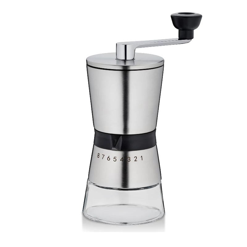 Kaffeemühle Carolina in der Farbe Silber aus Edelstahl mit Keramikmahlwerk. Maße Ø 8,5 cm, Höhe 21,5 cm.