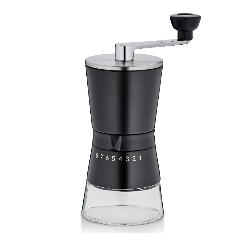 Kaffeemühle Carolina in der Farbe Schwarz aus Edelstahl mit Keramikmahlwerk. Maße Ø 8,5 cm, Höhe 21,5 cm.