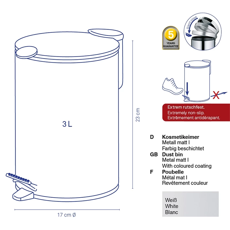 Kosmetikeimer Mats weiß, Metall matt beschichtet, Inneneimer aus Kunststoff, Volumen 3L, Höhe 23 cm.
