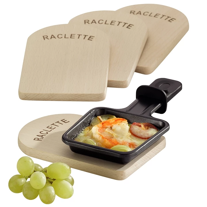 Oft ist die Frage, wohin mit den heißen Raclette-Pfännchen, wenn sie gerade nicht in Gebrauch sind. Praktische Abstellmöglichkeit: die 4 kleinen Raclette-Brettchen als Zubehör für Ihr Raclette.