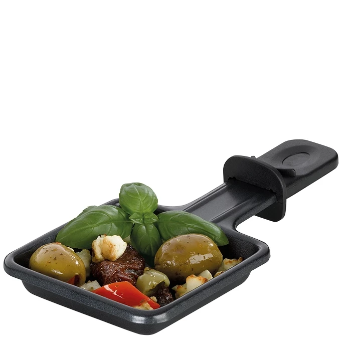 Dieses schwarze Raclettepfännchen aus schwarzem Metall ist Antihaftbeschichtet und passt als Ersatzteil für folgende Raclette-Geräte: