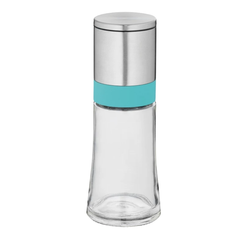 Salz- und Pfeffermühle Matteo aus Glas und Edelstahl mit Gummiring in pastelltürkis. Höhe 13 cm , Durchmesser 5 cm. 75 ml Volumen.