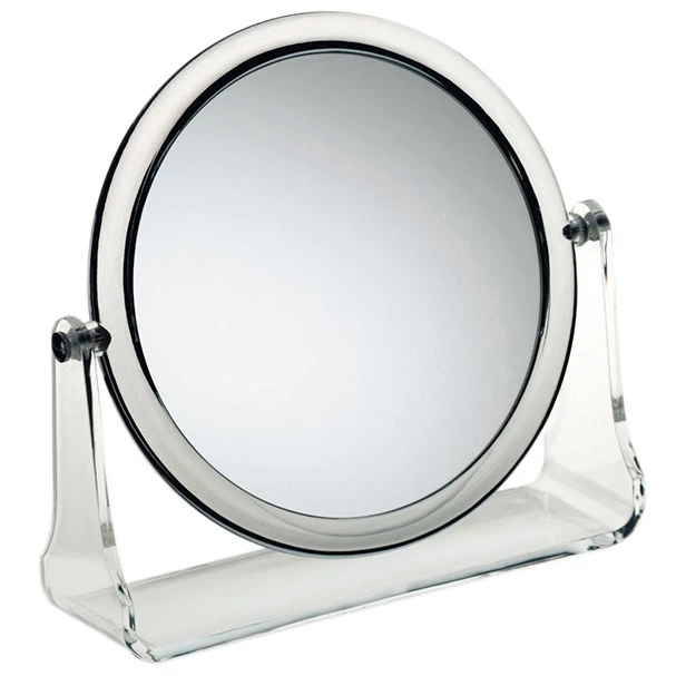 Sowohl der Rahmen als auch der Standfuß des Schminkspiegels sind aus transparentem Acrylglas.