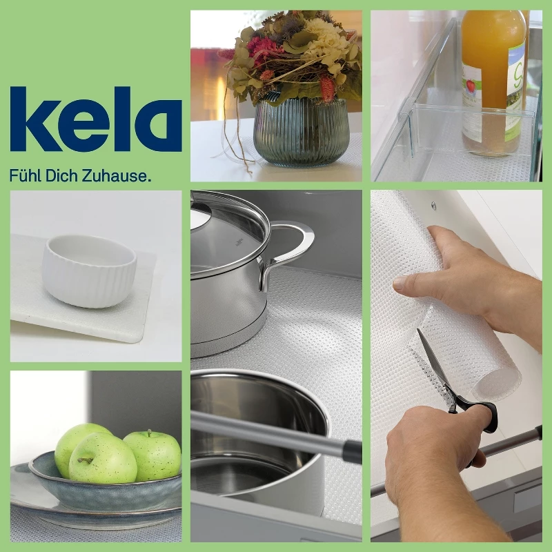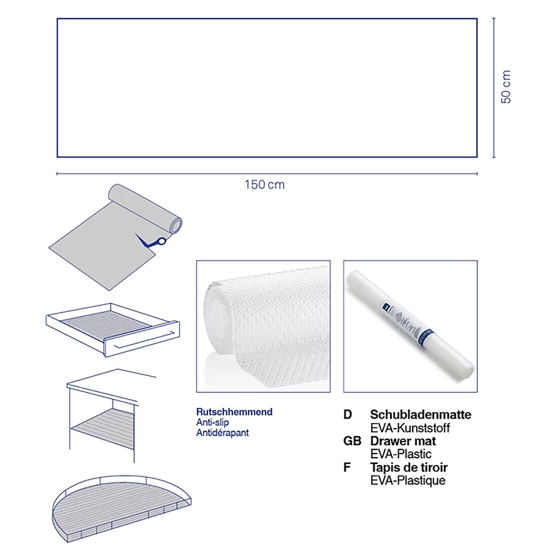 Das Verrutschen von Schubladeneinlagen oder anderen Gegenständen in Ihrer Schublade hat ein Ende. Mit der flexiblen Schubladenmatte Soletta bekommt Ihr Schubladen- oder Regalinhalt zukünftig einen schützenden Untergrund. Die Schubladenmatte für Ihre Küche aus Kunststoff ist transparent und variabel in alle Größen zuschneidbar. Insgesamt stehen Ihnen 150 x 50 cm an Material zum Zuschneiden zur Verfügung. Natürlich eignet sich diese Matte zum Beispiel auch als Untergrund für das Regal in Ihrer Küche, Vorratskammer oder anderen Orten.