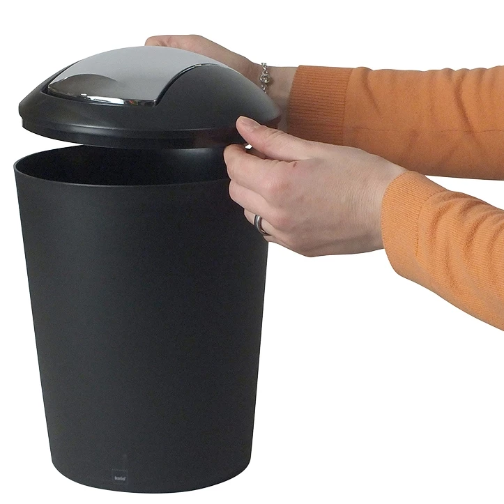Der Mülleimer ist aus Kunststoff und hat ein Volumen von 5 l. Durch seine reduzierte Form mit leicht gerundetem Schwingdeckel und die Farbkombination von Eimer und silberfarbenem Schwingteil, wirkt der Mülleimer zurückhaltend und elegant. Zum Entleeren wird der Deckel einfach abgenommen.