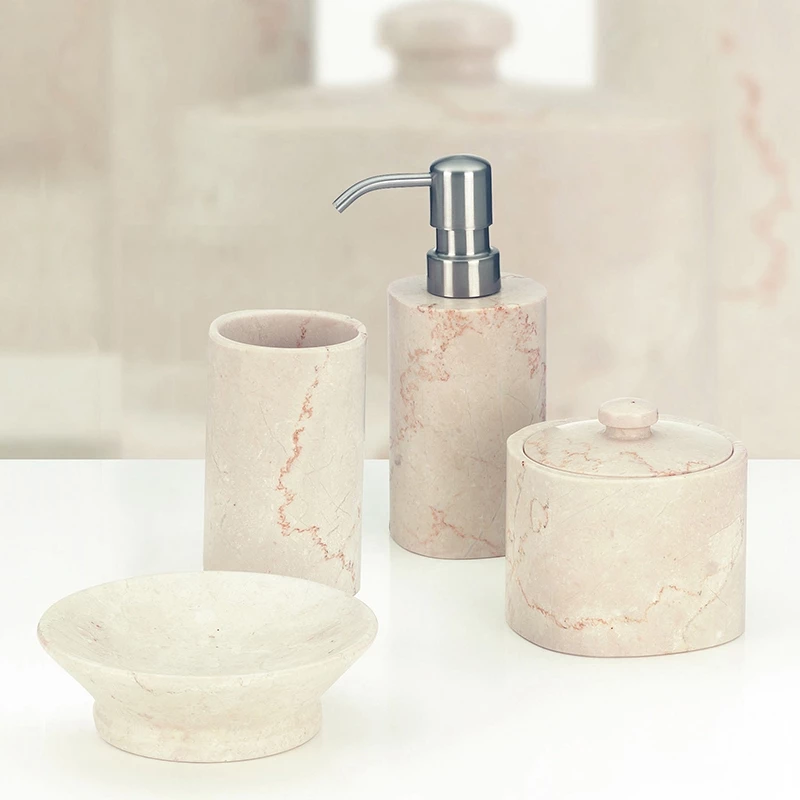Die hochwertigen Badaccessoires sind aus massivem, hellen Carrara Marmor, dessen Oberfläche angenehm glatt aufbereitet wird. Da es sich um ein Naturprodukt handelt, ist jeder Artikel ein Unikat.