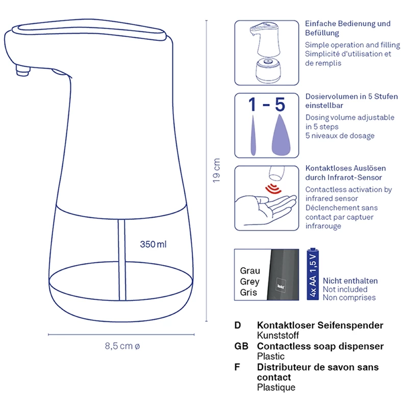 Seifenspender Aurie Comfort mit Sensor für 350 ml Flüssigseife! Farbe Dunkelgrau: Maße: Höhe 19 cm, Ø 8,5 cm.