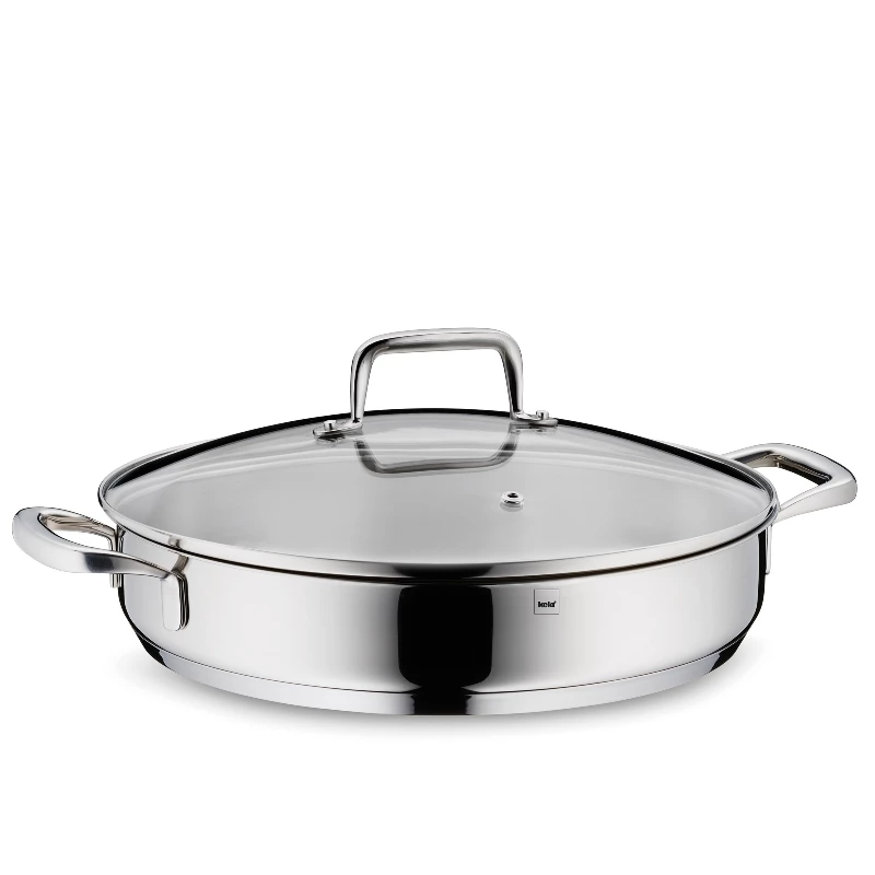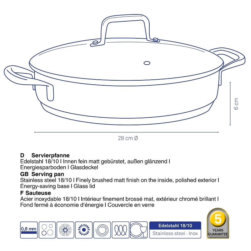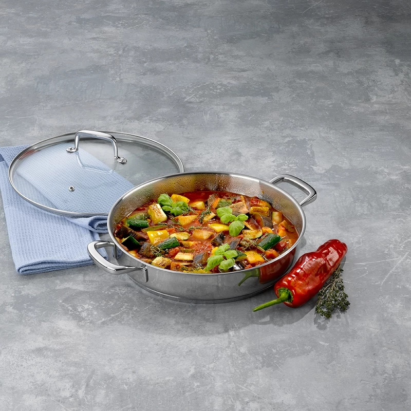 Servierpfanne Flavoria aus Edelstahl mit Glasdeckel. Maße: 28 cm Ø, Höhe 6 cm.