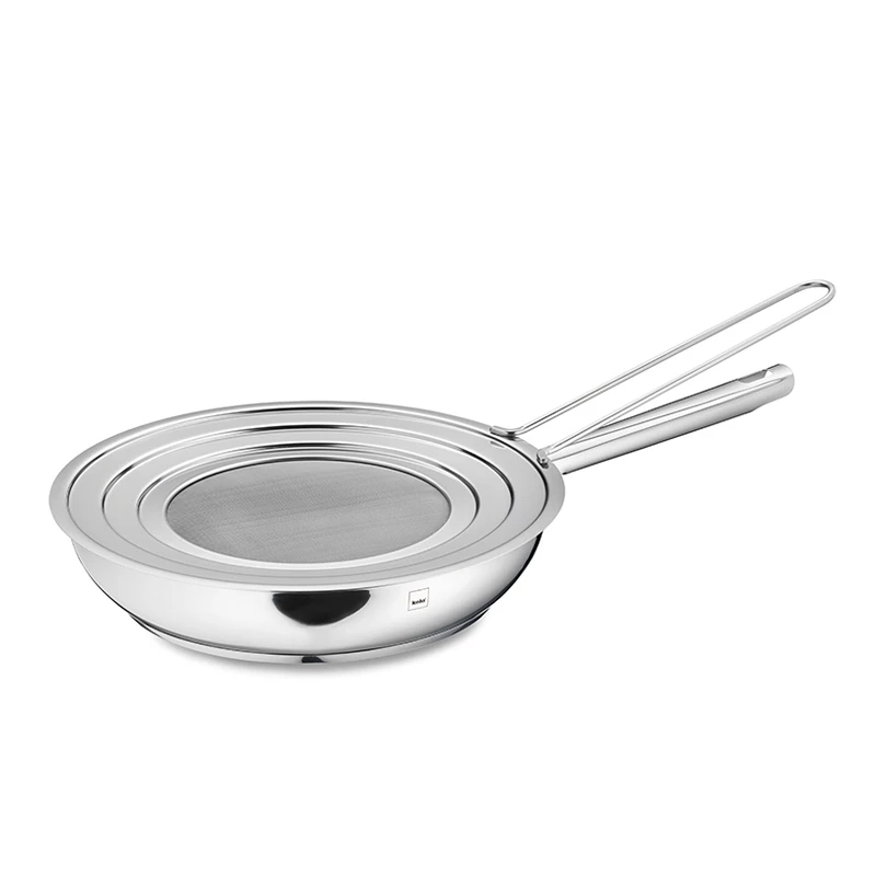 Dieser Spritzschutz aus Edelstahl 18/10 besitzt einen feinen Siebeinsatz, sodass der Dampf entweichen kann und man beim Braten oder Kochen dennoch nicht Gefahr läuft von Fett, Öl oder anderen Flüssigkeiten angespritzt zu werden. Dadurch dass dennoch Dampf entweichen kann, gelingt das Bratgut besonders gut und knusprig. Mit dem praktischen langen Griff hat man immer ausreichend Abstand zur Pfanne. Durch die stufenförmige Anordnung ist der Spritzschutz in der Küche nutzbar für Töpfe und Pfannen mit ca. 20, 24 oder 28 cm Durchmesser.
