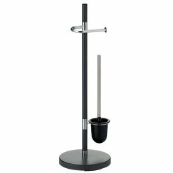Toilettengarnitur Sinerio aus verchromtem Metall und einer matten Pulverbeschichtung in Anthrazit. Höhe: 76,5 cm. Die Bodenplatte hat einen Durchmesser von 25 cm.