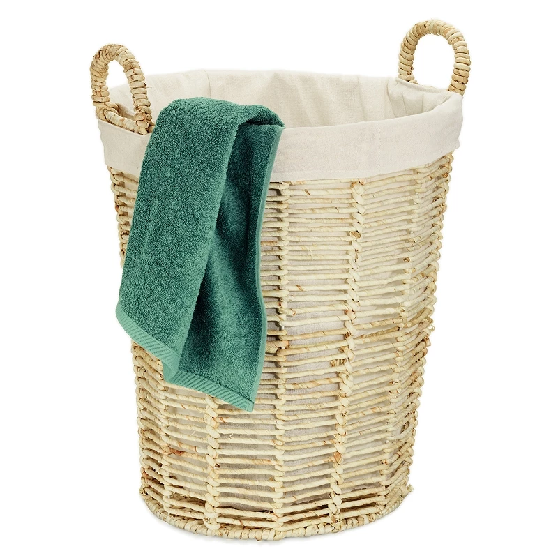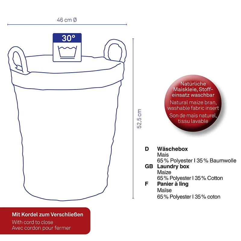 Die schöne Wäschebox macht nicht nur optisch einen natürlichen Eindruck, es steckt auch Natur drin. Diese Wäschebox besteht aus Maiskleie und besitzt einen Einsatz aus Polyester/Baumwolle. Dieser Stoffeinsatz ist herausnehmbar und waschbar bei bis zu 30° C. Besonderer Clou: Der Einsatz ist verschließbar mit Hilfe einer Kordel.