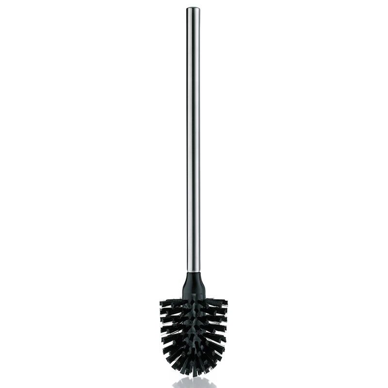 Die Ersatz-WC-Bürste mit Griff und schwarzem Bürstenkopf in einer Softvariante hat eine Länge von 42,5 cm und einen Durchmesser von 8 cm. Mit Griff aus Edelstahl in glänzender Optik.