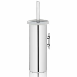 WC-Garnitur Alor zur Wandmontage aus Edelstahl 18/10 mit hellgrauem Kunststoffbecher und hellgrauem Bürstenkopf. Die Bürste und die Bürstengriffe von dieser Garnitur sind austauschbar. Es passt die Bürste La Brosse in allen Farben (20140, 20141, etc.) Gesamthöhe inklusive Griff 38 cm, Ø 11,5 cm.