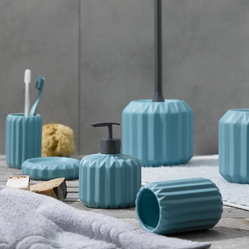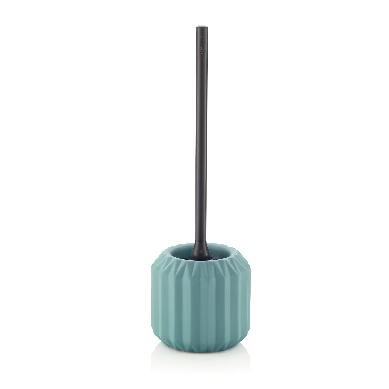 Verspielt, Präsent, Modern. So präsentieren sich die Badezimmer Accessoires aus Keramik in der Farbe Aqua und mit matter Oberfläche. Der dunkelgraue Kunststoffgriff mit passender WC-Bürste harmoniert wunderschön mit dieser auffälligen Farbe.